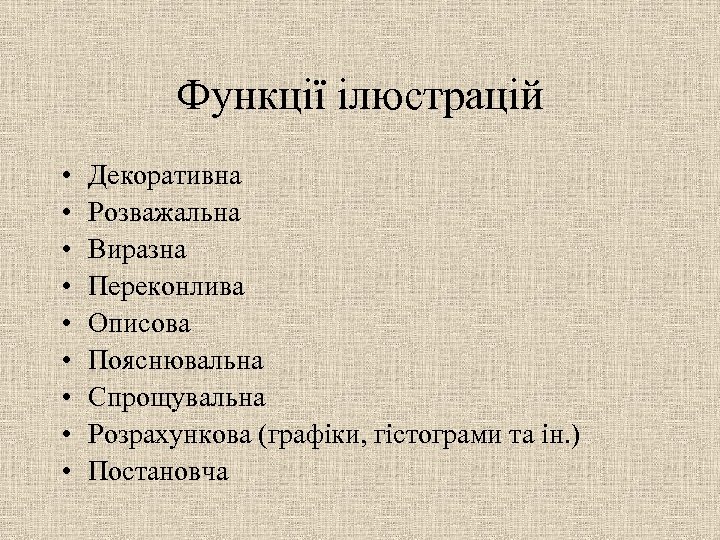 Функції ілюстрацій • • • Декоративна Розважальна Виразна Переконлива Описова Пояснювальна Спрощувальна Розрахункова (графіки, гістограми та ін. ) Постановча