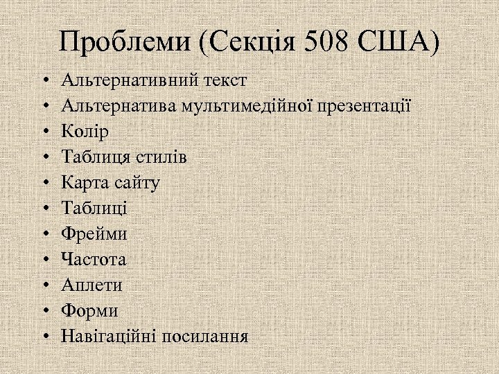 Проблеми (Секція 508 США) • • • Альтернативний текст Альтернатива мультимедійної презентації Колір Таблиця стилів Карта сайту Таблиці Фрейми Частота Аплети Форми Навігаційні посилання