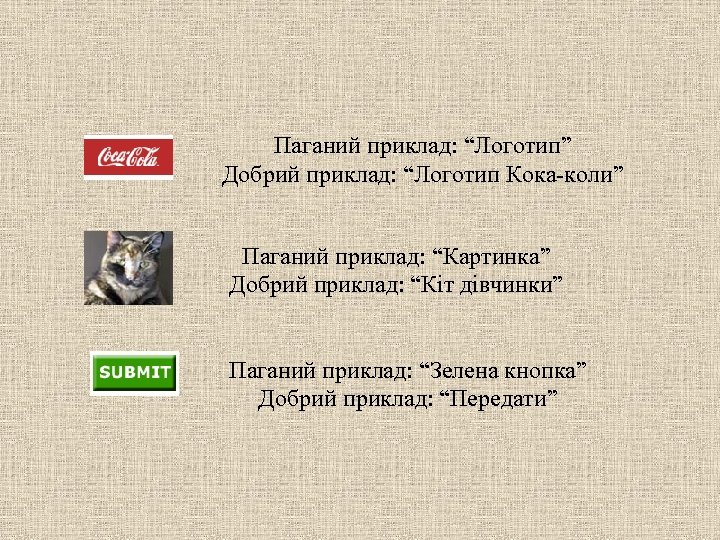 Паганий приклад: “Логотип” Добрий приклад: “Логотип Кока-коли” Паганий приклад: “Картинка” Добрий приклад: “Кіт дівчинки” Паганий приклад: “Зелена кнопка” Добрий приклад: “Передати”