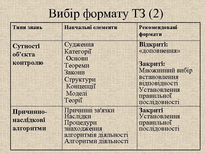 Вибір формату ТЗ (2) Типи знань Навчальні елементи Рекомендовані формати Сутності об'єкта контролю Суджения Категорії Основи Теореми Закони Структури Концепції Моделі Теорії Причинні зв'язки Наслідки Процедури знаходження алгоритмів діяльності Алгоритми діяльності Відкриті: «доповнення» Причиннонаслідкові алгоритми Закриті: Множинний вибір встановлення відповідності Установлення правильної послідовності Закриті Установлення правильної послідовності