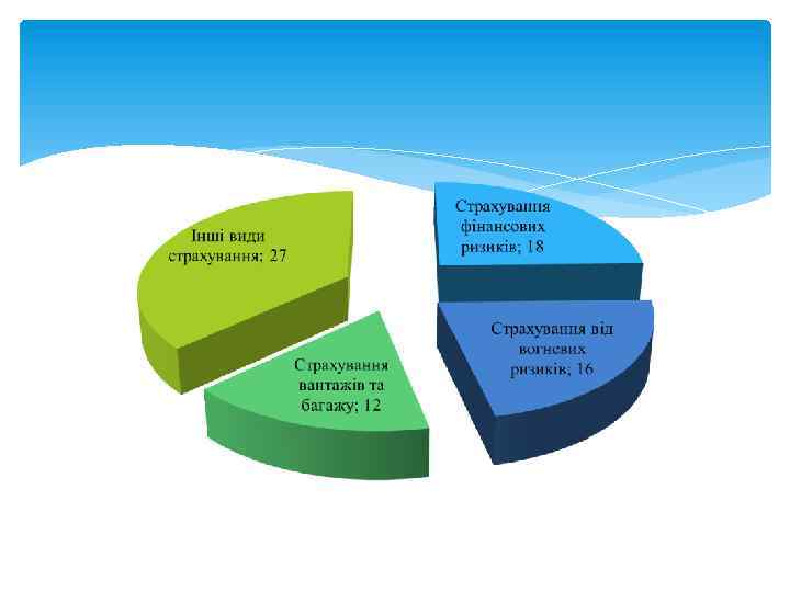 СТРУКТУРА ПЕРЕСТРАХУВАННЯ В УКРАЇНІ Види страхування 01. 04. 2011 р. 01. 04. 2010 р. Страхування майна 867, 8 млн. грн. (27%) 692, 3 млн. грн. (31%) Темп зростання 79, 8% Страхування фінансових ризиків 601, 8 млн. грн. (18%) 419, 5 млн. грн. (19%) 69, 7% Страхування від вогневих ризиків 537, 5 млн. грн. (16%) 403, 4 млн. грн. (18%) 75, 1% Страхування вантажів 399, 9 млн. грн. (12%) та багажу 228, 9 млн. грн. (10%) 57, 2% Інші види страхування 944, 1 млн. грн. (27%) 660, 8 млн. грн. (22%) Всього 3381, 1 млн. грн. (100%)2404, 9 млн. грн. (100%) 70, 1% 71, 1%