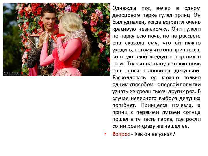 • Однажды под вечер в одном дворцовом парке гулял принц. Он был удивлен, когда встретил очень красивую незнакомку. Они гуляли по парку всю ночь, но на рассвете она сказала ему, что ей нужно уходить, потому что она принцесса, которую злой колдун превратил в розу. Только на одну летнюю ночь она снова становится девушкой. Расколдовать ее можно только одним способом - с первой попытки узнать ее среди тысяч других роз. В случае неверного выбора девушка погибнет. Принцесса исчезла, а принц с первыми лучами солнца пошел в ту часть парка, где росли сотни роз и сразу же нашел ее. • Вопрос - Как он ее узнал? • Ответ: На ней не было росы. . .
