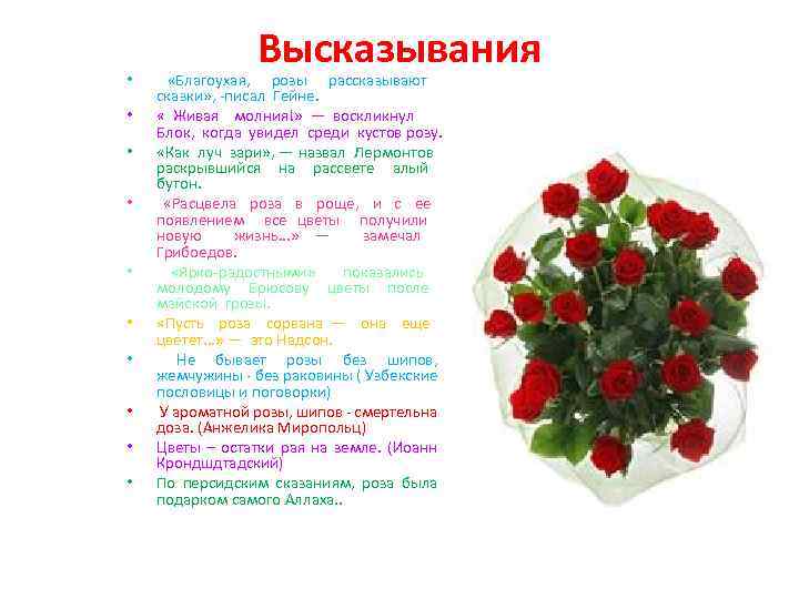 • • • Высказывания «Благоухая, розы рассказывают сказки» , -писал Гейне. « Живая молния!» — воскликнул Блок, когда увидел среди кустов розу. «Как луч зари» , — назвал Лермонтов раскрывшийся на рассвете алый бутон. «Расцвела роза в роще, и с ее появлением все цветы получили новую жизнь. . . » — замечал Грибоедов. «Ярко-радостными» показались молодому Брюсову цветы после майской грозы. «Пусть роза сорвана — она еще цветет. . . » — это Надсон. Не бывает розы без шипов, жемчужины - без раковины ( Узбекские пословицы и поговорки) У ароматной розы, шипов - смертельна доза. (Анжелика Миропольц) Цветы – остатки рая на земле. (Иоанн Крондшдтадский) По персидским сказаниям, роза была подарком самого Аллаха. .