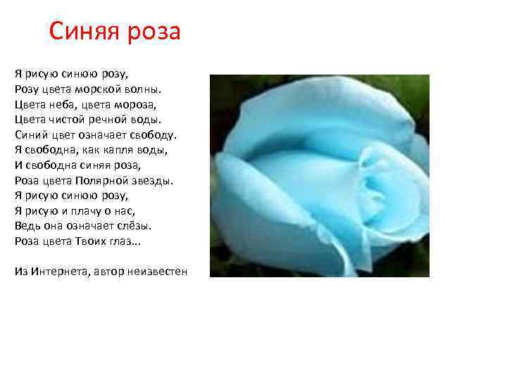 Синяя роза Я рисую синюю розу, Розу цвета морской волны. Цвета неба, цвета мороза, Цвета чистой речной воды. Синий цвет означает свободу. Я свободна, как капля воды, И свободна синяя роза, Роза цвета Полярной звезды. Я рисую синюю розу, Я рисую и плачу о нас, Ведь она означает слёзы. Роза цвета Твоих глаз. . . Из Интернета, автор неизвестен