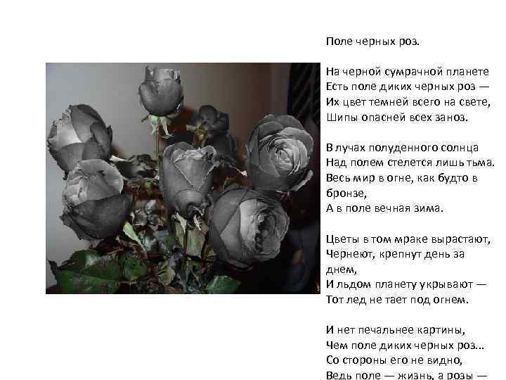 Поле черных роз. На черной сумрачной планете Есть поле диких черных роз — Их цвет темней всего на свете, Шипы опасней всех заноз. В лучах полуденного солнца Над полем стелется лишь тьма. Весь мир в огне, как будто в бронзе, А в поле вечная зима. Цветы в том мраке вырастают, Чернеют, крепнут день за днем, И льдом планету укрывают — Тот лед не тает под огнем. И нет печальнее картины, Чем поле диких черных роз. . . Со стороны его не видно, Ведь поле — жизнь, а розы —