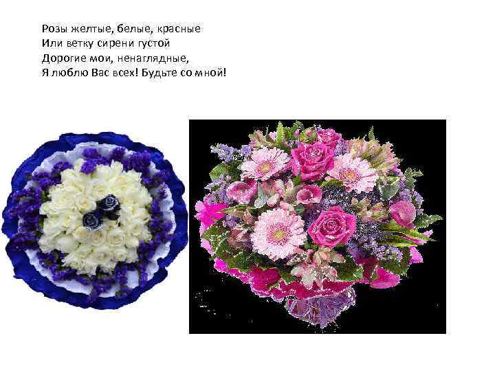 Розы желтые, белые, красные Или ветку сирени густой Дорогие мои, ненаглядные, Я люблю Вас всех! Будьте со мной!