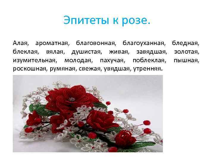 Эпитеты к розе. Алая, ароматная, благовонная, благоуханная, бледная, блеклая, вялая, душистая, живая, завядшая, золотая, изумительная, молодая, пахучая, поблеклая, пышная, роскошная, румяная, свежая, увядшая, утренняя.