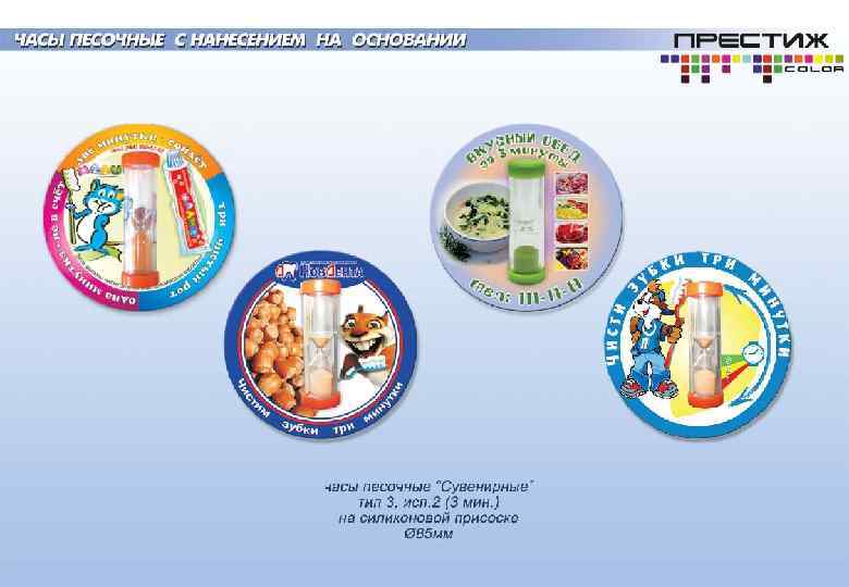 Специальное предложение для стоматологических клиник, а также производителей косметологических и стоматологических средств – песочные часы на 3 минуты. Такой сувенир можно презентовать клиентам, использовать в рекламных акциях, размещать в санаториях, детских садах и лагерях. Возможность их практического использования обеспечит долгосрочную рекламу Вашему продукту или услугам.