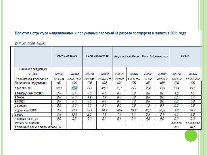 Преобладание российского рубля в обслуживании взаимного товарооборота стран Евр. Аз. ЭС. Основная масса рублевого оборота приходится на саму Россию как на эмитента расчетной валюты. Что же касается других пользователей, то главным среди них остается Белоруссия.