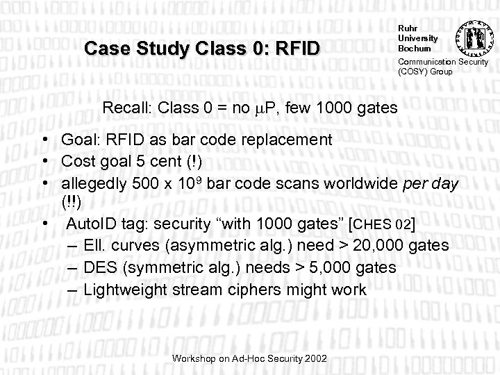 Case Study Class 0: RFID Ruhr University Bochum Communication Security (COSY) Group Recall: Class 0 = no P, few 1000 gates • Goal: RFID as bar code replacement • Cost goal 5 cent (!) • allegedly 500 x 109 bar code scans worldwide per day (!!) • Auto. ID tag: security “with 1000 gates” [CHES 02] – Ell. curves (asymmetric alg. ) need > 20, 000 gates – DES (symmetric alg. ) needs > 5, 000 gates – Lightweight stream ciphers might work Workshop on Ad-Hoc Security 2002
