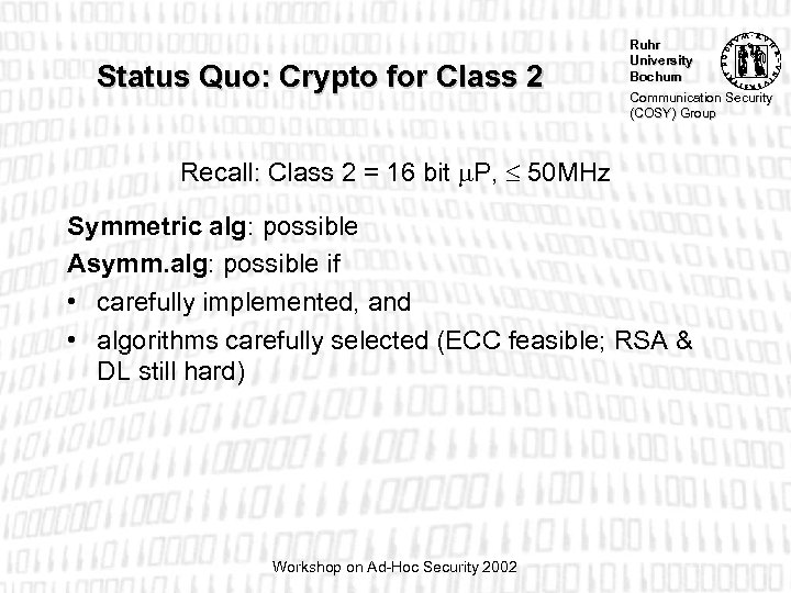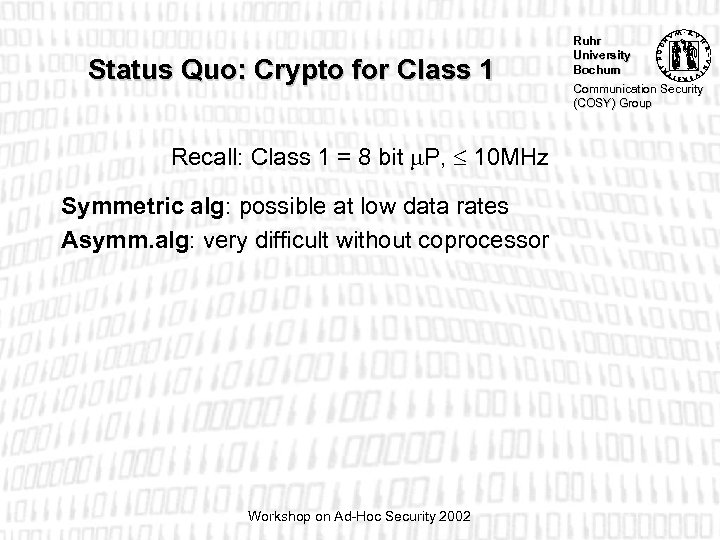Status Quo: Crypto for Class 1 Recall: Class 1 = 8 bit P, 10 MHz Symmetric alg: possible at low data rates Asymm. alg: very difficult without coprocessor Workshop on Ad-Hoc Security 2002 Ruhr University Bochum Communication Security (COSY) Group