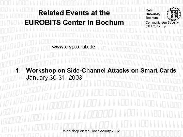 Related Events at the EUROBITS Center in Bochum Ruhr University Bochum Communication Security (COSY) Group www. crypto. rub. de 1. Workshop on Side-Channel Attacks on Smart Cards January 30 -31, 2003 Workshop on Ad-Hoc Security 2002