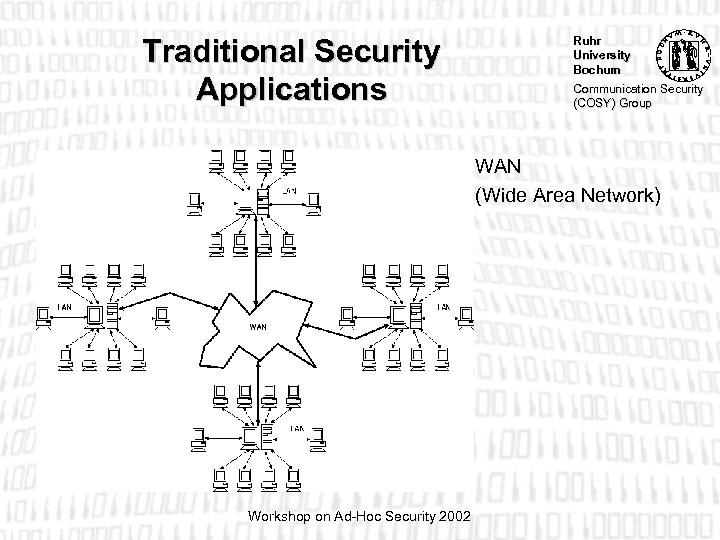 Traditional Security Applications Ruhr University Bochum Communication Security (COSY) Group WAN (Wide Area Network) Workshop on Ad-Hoc Security 2002