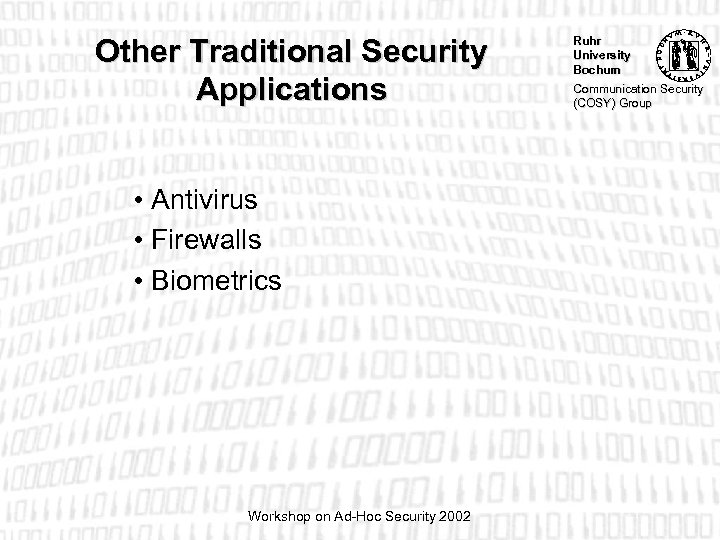 Other Traditional Security Applications • Antivirus • Firewalls • Biometrics Workshop on Ad-Hoc Security 2002 Ruhr University Bochum Communication Security (COSY) Group