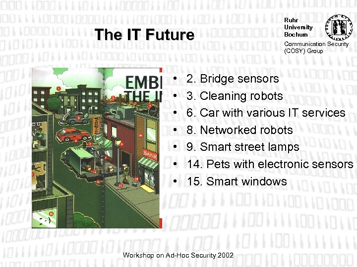 The IT Future • • Ruhr University Bochum Communication Security (COSY) Group 2. Bridge sensors 3. Cleaning robots 6. Car with various IT services 8. Networked robots 9. Smart street lamps 14. Pets with electronic sensors 15. Smart windows Workshop on Ad-Hoc Security 2002