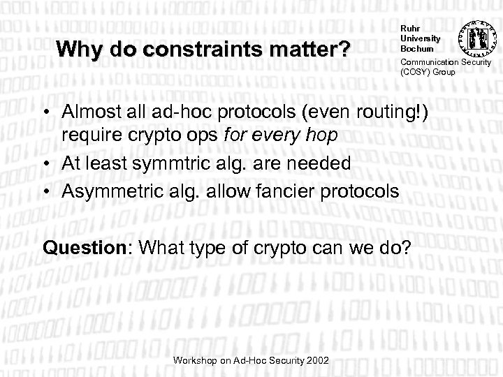 Why do constraints matter? Ruhr University Bochum Communication Security (COSY) Group • Almost all ad-hoc protocols (even routing!) require crypto ops for every hop • At least symmtric alg. are needed • Asymmetric alg. allow fancier protocols Question: What type of crypto can we do? Workshop on Ad-Hoc Security 2002