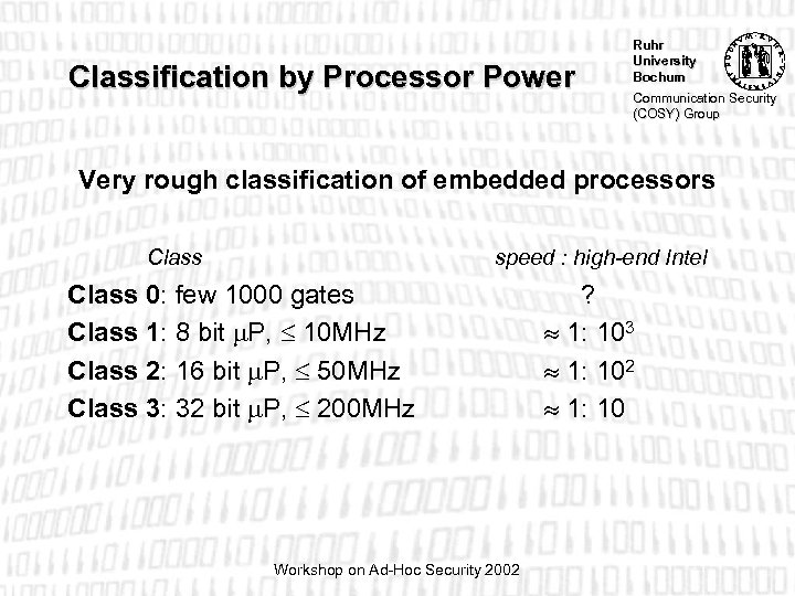 Classification by Processor Power Ruhr University Bochum Communication Security (COSY) Group Very rough classification of embedded processors Class speed : high-end Intel Class 0: few 1000 gates Class 1: 8 bit P, 10 MHz Class 2: 16 bit P, 50 MHz Class 3: 32 bit P, 200 MHz Workshop on Ad-Hoc Security 2002 ? 1: 103 1: 102 1: 10