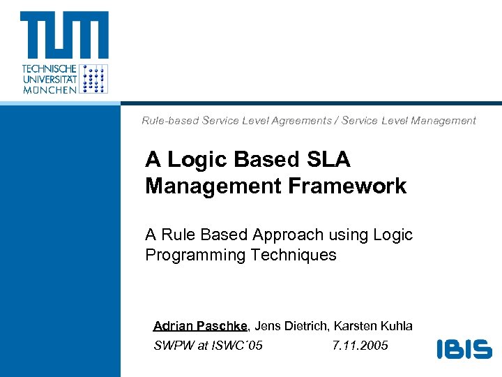Rule-based Service Level Agreements / Service Level Management A Logic Based SLA Management Framework A Rule Based Approach using Logic Programming Techniques Adrian Paschke, Jens Dietrich, Karsten Kuhla SWPW at ISWC´ 05 7. 11. 2005