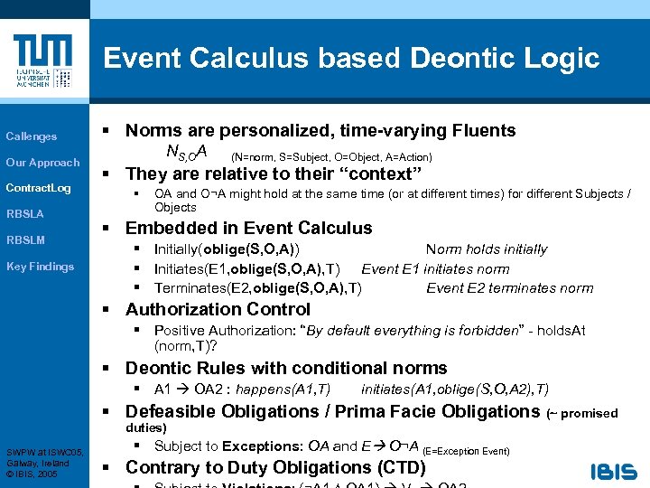 Event Calculus based Deontic Logic Callenges Our Approach Contract. Log RBSLA RBSLM Key Findings § Norms are personalized, time-varying Fluents NS, OA (N=norm, S=Subject, O=Object, A=Action) § They are relative to their “context” § OA and O¬A might hold at the same time (or at different times) for different Subjects / Objects § Embedded in Event Calculus § Initially(oblige(S, O, A)) Norm holds initially § Initiates(E 1, oblige(S, O, A), T) Event E 1 initiates norm § Terminates(E 2, oblige(S, O, A), T) Event E 2 terminates norm § Authorization Control § Positive Authorization: “By default everything is forbidden” - holds. At (norm, T)? § Deontic Rules with conditional norms § A 1 OA 2 : happens(A 1, T) initiates(A 1, oblige(S, O, A 2), T) § Defeasible Obligations / Prima Facie Obligations (~ promised duties) SWPW at ISWC 05, Galway, Ireland © IBIS, 2005 § Subject to Exceptions: OA and E O¬A (E=Exception Event) § Contrary to Duty Obligations (CTD)