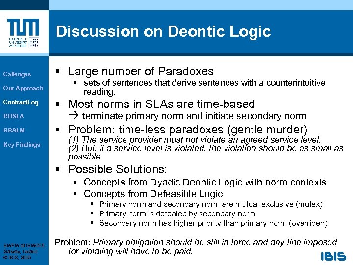 Discussion on Deontic Logic Callenges Our Approach Contract. Log RBSLA RBSLM Key Findings § Large number of Paradoxes § sets of sentences that derive sentences with a counterintuitive reading. § Most norms in SLAs are time-based terminate primary norm and initiate secondary norm § Problem: time-less paradoxes (gentle murder) (1) The service provider must not violate an agreed service level. (2) But, if a service level is violated, the violation should be as small as possible. § Possible Solutions: § Concepts from Dyadic Deontic Logic with norm contexts § Concepts from Defeasible Logic § Primary norm and secondary norm are mutual exclusive (mutex) § Primary norm is defeated by secondary norm § Secondary norm has higher priority than primary norm (overriden) SWPW at ISWC 05, Galway, Ireland © IBIS, 2005 Problem: Primary obligation should be still in force and any fine imposed for violating will have to be paid.