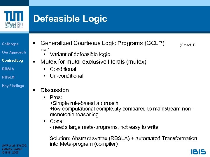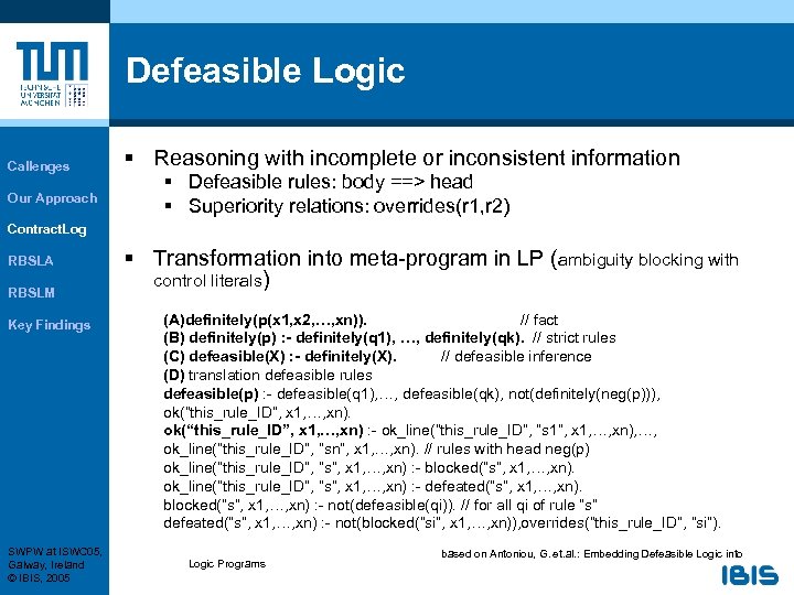 Defeasible Logic Callenges Our Approach Contract. Log RBSLA RBSLM Key Findings § Generalized Courteous Logic Programs (GCLP) (Grosof, B. et. al. ) § Variant of defeasible logic § Mutex for mutal exclusive literals (mutex) § Conditional § Un-conditional § Discussion § Pros: +Simple rule-based approach +low computational complexity compared to mainstream nonmonotonic reasoning § Cons: - needs large meta-programs, not easy to write SWPW at ISWC 05, Galway, Ireland © IBIS, 2005 Solution: Abstract syntax (RBSLA) + automated Transformation into Meta-program (compiler)