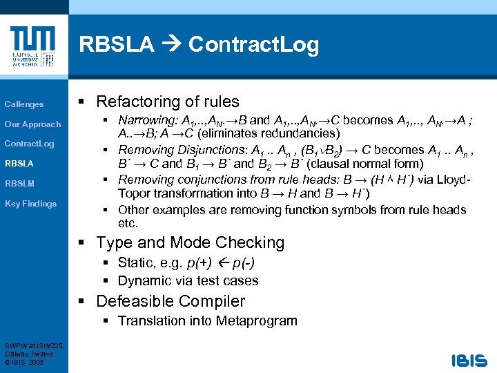 RBSLA Contract. Log Callenges Our Approach Contract. Log RBSLA RBSLM Key Findings § Refactoring of rules § Narrowing: A 1, . . , AN. →B and A 1, . . , AN. →C becomes A 1, . . , AN. →A ; A. . →B; A →C (eliminates redundancies) § Removing Disjunctions: A 1. . An , (B 1 B 2) → C becomes A 1. . An , B´ → C and B 1 → B´ and B 2 → B´ (clausal normal form) § Removing conjunctions from rule heads: B → (H ٨ H´) via Lloyd. Topor transformation into B → H and B → H`) § Other examples are removing function symbols from rule heads etc. § Type and Mode Checking § Static, e. g. p(+) p(-) § Dynamic via test cases § Defeasible Compiler § Translation into Metaprogram SWPW at ISWC 05, Galway, Ireland © IBIS, 2005