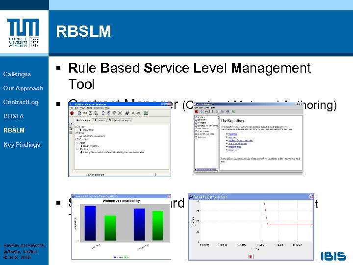 RBSLM Callenges Our Approach Contract. Log § Rule Based Service Level Management Tool § Contract Manager (Contract Mgt. and Authoring) RBSLA RBSLM Key Findings § Service Dashboard (Monitoring and Contract Tracking) SWPW at ISWC 05, Galway, Ireland © IBIS, 2005