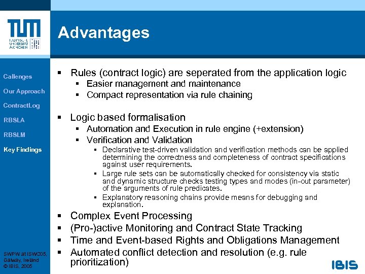 Advantages Callenges § Rules (contract logic) are seperated from the application logic § Easier management and maintenance § Compact representation via rule chaining Our Approach Contract. Log RBSLA § Logic based formalisation § Automation and Execution in rule engine (+extension) § Verification and Validation RBSLM § Declarative test-driven validation and verification methods can be applied determining the correctness and completeness of contract specifications against user requirements. § Large rule sets can be automatically checked for consistency via static and dynamic structure checks testing types and modes (in-out parameter) of the arguments of rule predicates. § Explanatory reasoning chains provide means for debugging and explanation. Key Findings SWPW at ISWC 05, Galway, Ireland © IBIS, 2005 § § Complex Event Processing (Pro-)active Monitoring and Contract State Tracking Time and Event-based Rights and Obligations Management Automated conflict detection and resolution (e. g. rule prioritization)