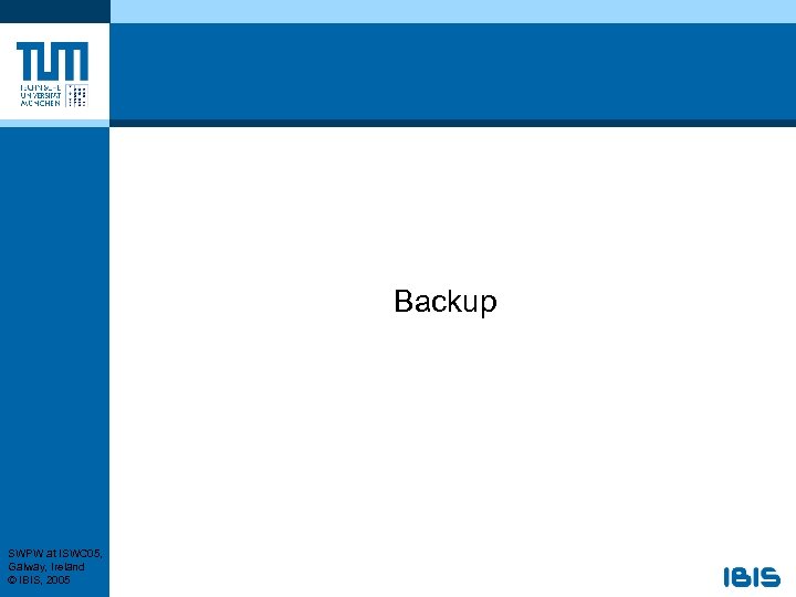 RBSLA Callenges Our Approach Contract. Log RBSLA RBSLM § Rule Based SLA Language (RBSLA) § Abtract declarative syntax Simplify authoring/writing of SLAs § Based on Rule. ML § Goals: § Machine-Readability and Execution (via Transformation) § Tool-Support § Interoperability with other languages Key Findings § Main extensions to Rule. ML: SWPW at ISWC 05, Galway, Ireland © IBIS, 2005 § Typed Logic and Procedural Attachments § External Data Integration § Event Condition Action Rules with Sensing, Monitoring and Effecting § (Situated) Update Primitives § Complex Event Processing and State Changes (Fluents) § Deontic Norms and Norm Violations and Exceptions § Defeasible Rules and Rule Priorities § Built-Ins, Aggregate and Compare Operators, Lists