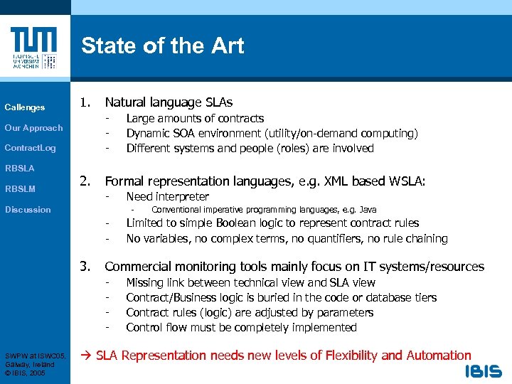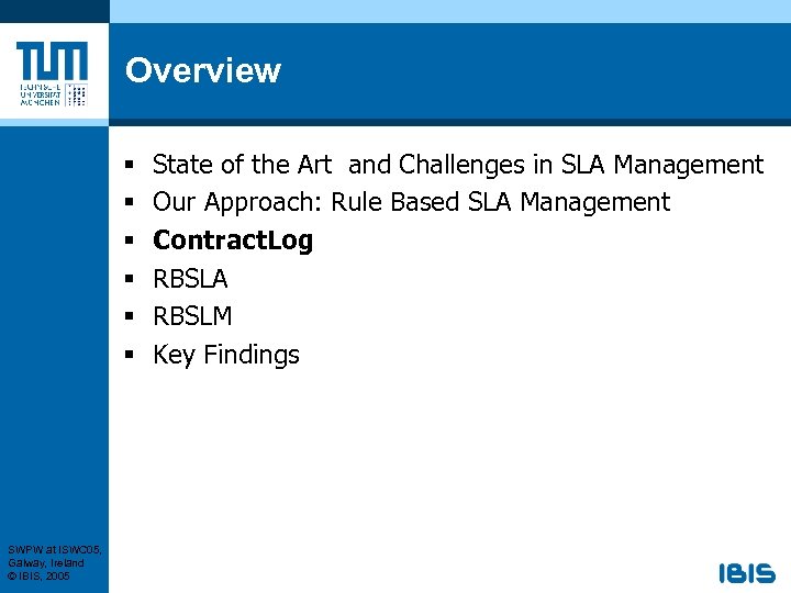 Overview § § § SWPW at ISWC 05, Galway, Ireland © IBIS, 2005 State of the Art and Challenges in SLA Management Our Approach: Rule Based SLA Management Contract. Log RBSLA RBSLM Key Findings