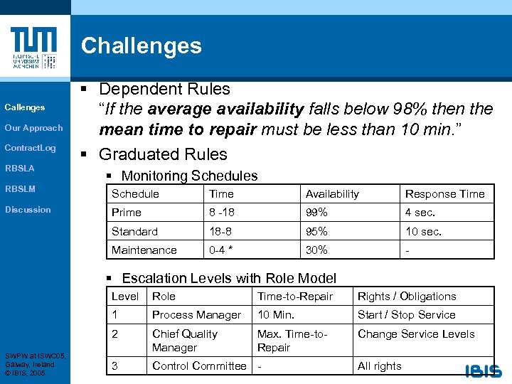 Challenges Callenges Our Approach Contract. Log RBSLA § Dependent Rules “If the average availability falls below 98% then the mean time to repair must be less than 10 min. ” § Graduated Rules § Monitoring Schedules RBSLM Schedule Time Availability Response Time Discussion Prime 8 -18 99% 4 sec. Standard 18 -8 95% 10 sec. Maintenance 0 -4 * 30% - § Escalation Levels with Role Model Level Time-to-Repair Rights / Obligations 1 Process Manager 10 Min. Start / Stop Service 2 SWPW at ISWC 05, Galway, Ireland © IBIS, 2005 Role Chief Quality Manager Max. Time-to. Repair Change Service Levels 3 Control Committee - All rights