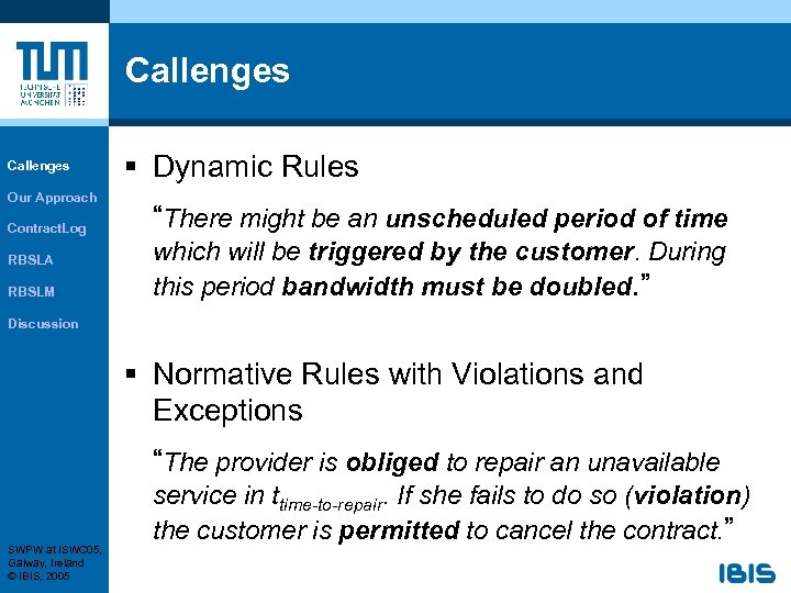 Callenges Our Approach Contract. Log RBSLA RBSLM § Dynamic Rules “There might be an unscheduled period of time which will be triggered by the customer. During this period bandwidth must be doubled. ” Discussion § Normative Rules with Violations and Exceptions “The provider is obliged to repair an unavailable SWPW at ISWC 05, Galway, Ireland © IBIS, 2005 service in ttime-to-repair. If she fails to do so (violation) the customer is permitted to cancel the contract. ”