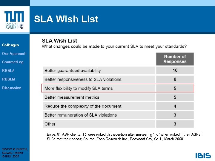 SLA Wish List Callenges Our Approach Contract. Log RBSLA RBSLM Discussion Base: 81 ASP clients; 15 were asked this question after answering “no” when asked if their ASPs’ SLAs met their needs; Source: Zona Research Inc. , Redwood City, Calif. , March 2000 SWPW at ISWC 05, Galway, Ireland © IBIS, 2005