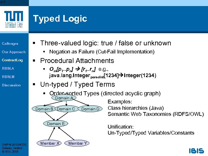 Typed Logic Callenges Our Approach Contract. Log RBSLA RBSLM Discussion § Three-valued logic: true / false or unknown § Negation as Failure (Cut-Fail Implementation) § Procedural Attachments § Om[p 1. . pn] [r 1. . rn] e. g. , java. lang. Integerparse. Int[1234] Integer(1234) § Un-typed / Typed Terms § Order-sorted Types (directed acyclic graph) Domain A Domain B Domain C Domain D Domain E SWPW at ISWC 05, Galway, Ireland © IBIS, 2005 Member X Examples: Class hierarchies (Java) Semantic Web Taxonomies (RDFS/OWL) Unification: Un-Typed/Typed Variables/Constants Member Y