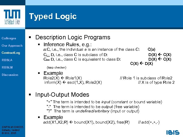 Typed Logic Callenges Our Approach Contract. Log RBSLA RBSLM Discussion § Description Logic Programs § Inference Rules, e. g. : a: C, i. e. , the individual a is an instance of the class C: C(a) C D, i. e. , class C is subclass of D: D(X) C(X) C D, i. e. , class C is equivalent to class D: D(X) C(X) D(X) (loop checker) § Example Role 2(X) Role 1(X) inform(X) escl(1, X), Role 2(X) // Role 1 is subclass of Role 2 // X is of type Role 2 § Input-Output Modes “+” The term is intended to be input (constant or bound variable) ”-“ The term is intended to be output (free variable) ”? ” The term is undefined/arbritary (input or output) § Example add(X 1, X 2, R) bound(X 1), bound(X 2), free(R) SWPW at ISWC 05, Galway, Ireland © IBIS, 2005 // add(+, +, -)
