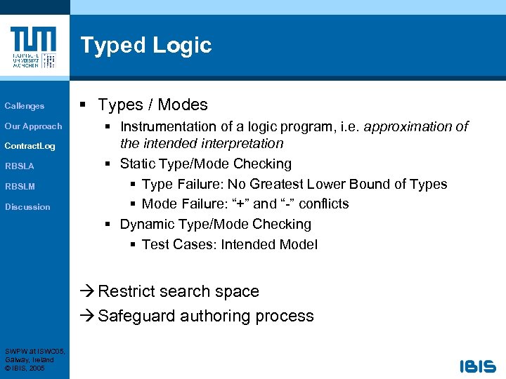 Typed Logic Callenges Our Approach Contract. Log RBSLA RBSLM Discussion § Types / Modes § Instrumentation of a logic program, i. e. approximation of the intended interpretation § Static Type/Mode Checking § Type Failure: No Greatest Lower Bound of Types § Mode Failure: “+” and “-” conflicts § Dynamic Type/Mode Checking § Test Cases: Intended Model Restrict search space Safeguard authoring process SWPW at ISWC 05, Galway, Ireland © IBIS, 2005