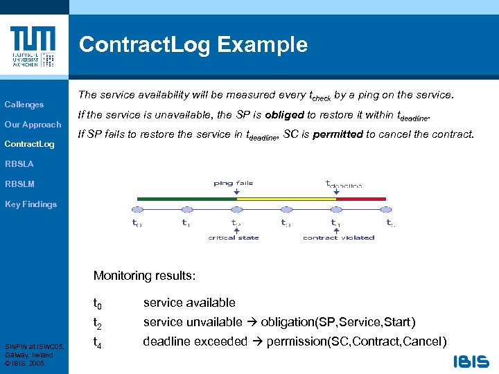 Contract. Log Example Callenges Our Approach Contract. Log The service availability will be measured every tcheck by a ping on the service. If the service is unavailable, the SP is obliged to restore it within tdeadline. If SP fails to restore the service in tdeadline, SC is permitted to cancel the contract. RBSLA RBSLM Key Findings Monitoring results: t 0 t 2 SWPW at ISWC 05, Galway, Ireland © IBIS, 2005 service available service unvailable obligation(SP, Service, Start) t 4 deadline exceeded permission(SC, Contract, Cancel)