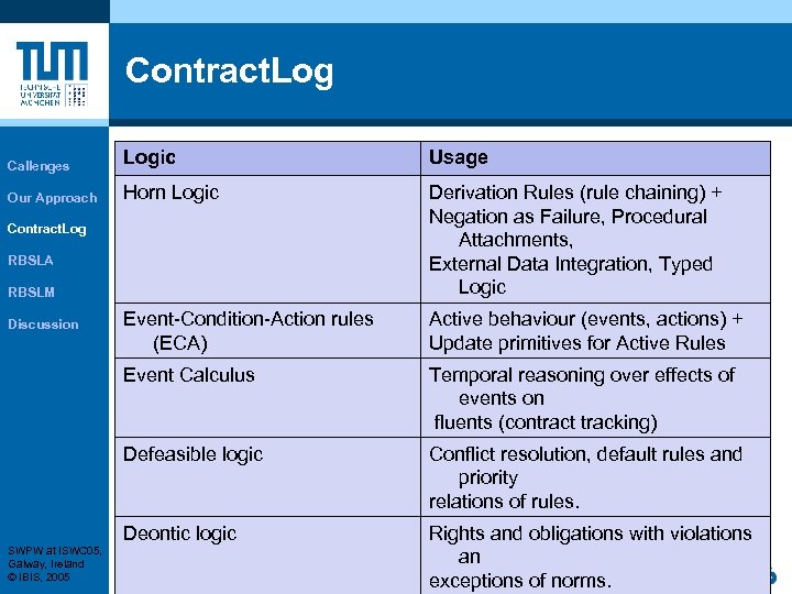 Contract. Log Callenges Logic Usage Our Approach Horn Logic Derivation Rules (rule chaining) + Negation as Failure, Procedural Attachments, External Data Integration, Typed Logic Event-Condition-Action rules (ECA) Active behaviour (events, actions) + Update primitives for Active Rules Event Calculus Temporal reasoning over effects of events on fluents (contract tracking) Defeasible logic Conflict resolution, default rules and priority relations of rules. Deontic logic Rights and obligations with violations an exceptions of norms. Contract. Log RBSLA RBSLM Discussion SWPW at ISWC 05, Galway, Ireland © IBIS, 2005