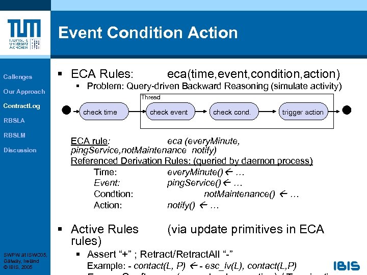 Event Condition Action Callenges Our Approach Contract. Log § ECA Rules: eca(time, event, condition, action) § Problem: Query-driven Backward Reasoning (simulate activity) Thread check time check event check cond. trigger action RBSLA RBSLM Discussion ECA rule: eca (every. Minute, ping. Service, not. Maintenance notify) Referenced Derivation Rules: (queried by daemon process) Time: every. Minute() … Event: ping. Service() … Condtion: not. Maintenance() … Action: notify() … § Active Rules rules) SWPW at ISWC 05, Galway, Ireland © IBIS, 2005 (via update primitives in ECA § Assert “+” ; Retract/Retract. All “-” Example: - contact(L, P) - esc_lv(L), contact(L, P)