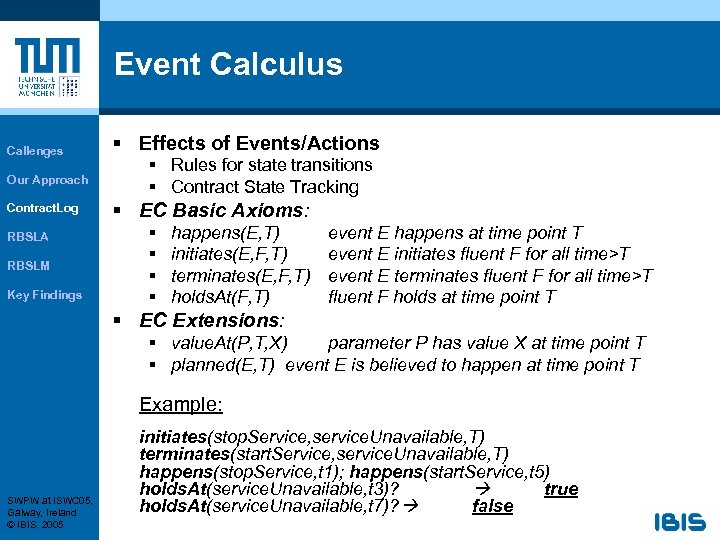 Event Calculus Callenges Our Approach Contract. Log RBSLA RBSLM Key Findings § Effects of Events/Actions § Rules for state transitions § Contract State Tracking § EC Basic Axioms: § § happens(E, T) initiates(E, F, T) terminates(E, F, T) holds. At(F, T) event E happens at time point T event E initiates fluent F for all time>T event E terminates fluent F for all time>T fluent F holds at time point T § EC Extensions: § value. At(P, T, X) parameter P has value X at time point T § planned(E, T) event E is believed to happen at time point T Example: SWPW at ISWC 05, Galway, Ireland © IBIS, 2005 initiates(stop. Service, service. Unavailable, T) terminates(start. Service, service. Unavailable, T) happens(stop. Service, t 1); happens(start. Service, t 5) holds. At(service. Unavailable, t 3)? true holds. At(service. Unavailable, t 7)? false