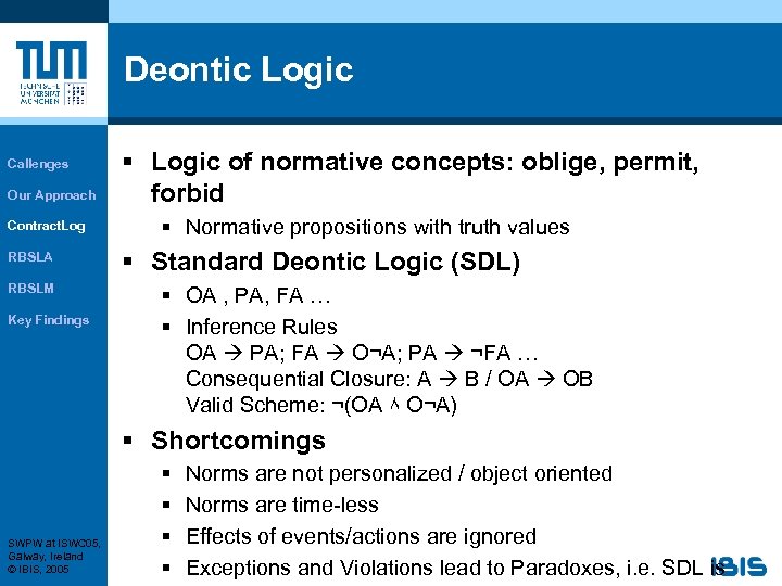 Deontic Logic Callenges Our Approach Contract. Log RBSLA RBSLM Key Findings § Logic of normative concepts: oblige, permit, forbid § Normative propositions with truth values § Standard Deontic Logic (SDL) § OA , PA, FA … § Inference Rules OA PA; FA O¬A; PA ¬FA … Consequential Closure: A B / OA OB Valid Scheme: ¬(OA ٨ O¬A) § Shortcomings SWPW at ISWC 05, Galway, Ireland © IBIS, 2005 § § Norms are not personalized / object oriented Norms are time-less Effects of events/actions are ignored Exceptions and Violations lead to Paradoxes, i. e. SDL is