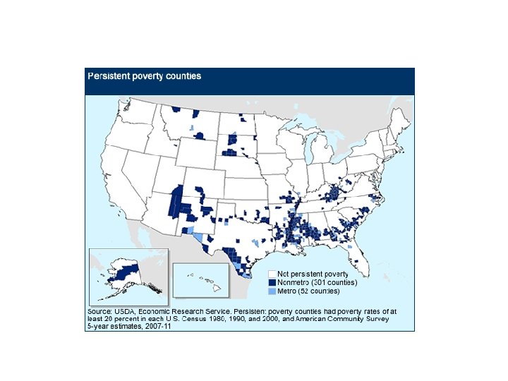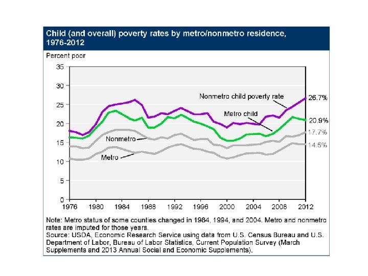 Socio-economic determinants Rural residents tend to be poorer than urban residents Per capita income is $9, 864 less for rural (2012) 21% of food stamp beneficiaries are rural (2014) 27% of rural children live in poverty (21% urban) Rural residents’ educational attainment 16. 6% have < high school education (13. 9% urban) 17. 6% have a Bachelor’s degree or higher (30. 5% urban) htthttp: //www. ers. usda. gov/statefacts/US. HTM Source: http: //www. ers. usda. gov/data-products/state-fact-sheets/state-data. aspx#. VFp. OS_n. F 91 Y 8