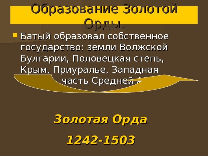 Образование Золотой Орды. Батый образовал собственное государство: земли Волжской Булгарии, Половецкая степь, Крым, Приуралье, Западная Сибирь, часть Средней Азии. Золотая Орда 1242 —