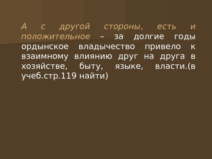 А с другой стороны , есть и положительное – за долгие годы ордынское владычество привело к взаимному влиянию друг на друга в хозяйстве, быту, языке, власти. (в учеб. стр. 119 найти)