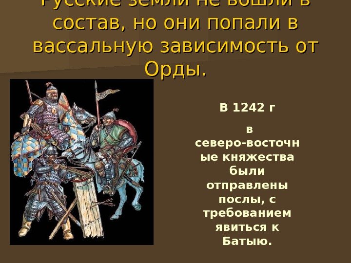 Русские земли не вошли в состав, но они попали в вассальную зависимость от Орды. В 1242 г в северо-восточн ые княжества были отправлены послы, с требованием явиться к Батыю.