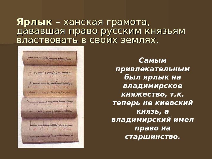 Ярлык –– ханская грамота, дававшая право русским князьям властвовать в своих землях. Самым привлекательным был ярлык на владимирское княжество, т. к. теперь не киевский князь, а владимирский имел право на старшинство.