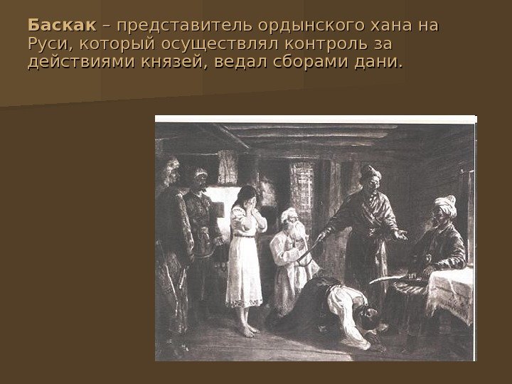 Баскак – представитель ордынского хана на Руси, который осуществлял контроль за действиями князей, ведал сборами дани.