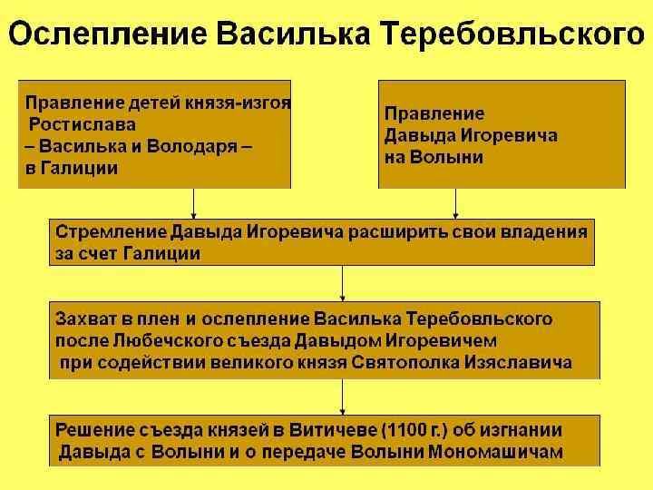 Любечский съезд Прошло несколько дней, и стало ясно, что никакими угрозами и карами не унять князей, борющихся за передел земель, за власть и богатства. Участники совещания еще не достигли своих городов, а из Киева пришла ужасная весть: Святополк киевский и Давыд владимиро-волынский схватили князя Василька и ослепили его.