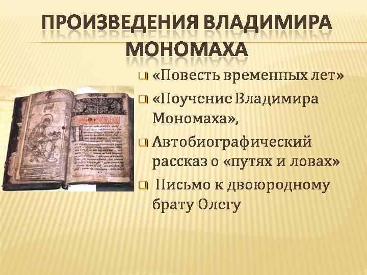 Литературное наследие Мономаха «Поучение детям» Роспись путей и ловов» Письмо Олегу Святославичу (Гориславичу)
