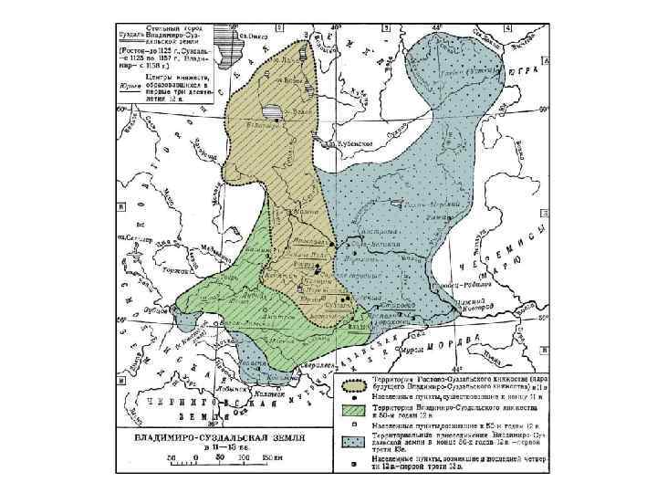 Владимиро-Суздальское княжество Ø Владимиро-Суздальское княжество расценивается как классический образец русского княжества периода феодальной раздробленности. Ø Оно занимало огромную территорию северо-восточных земель — от Северной Двины до Оки и от истоков Волги до впадения Оки в Волгу. Владимиро-Суздальская Русь стала со временем центром, вокруг которого объединялись русские земли, складывалось Русское централизованное государство. На территории Владимиро. Суздальского княжества образовалась Москва, ставшая со временем столицей великого государства. Ø В середине XII. во Владимиро-Суздальское княжество перешел из Киева великокняжеский титул. Все владимиро-суздальские князья носили великокняжеский титул. Это ставило Владимиро-Суздальское княжество в центральное положение по сравнению с другими русскими княжествами периода феодальной раздробленности Ø Ростов Великий и Суздаль — два древнейших русских города. В 1108 г. Владимир Мономах основал г. Владимир на Клязьме и включил в состав Ростово-Суздальского княжества. Позже Андрей Боголюбский (1157 — 1174) перенёс столицу княжества из Ростова во Владимир. Ø Владимиро-Суздальское княжество характеризовалось наличием сильного боярства. Вся история княжества - это бесконечная борьба князя и влиятельных бояр.